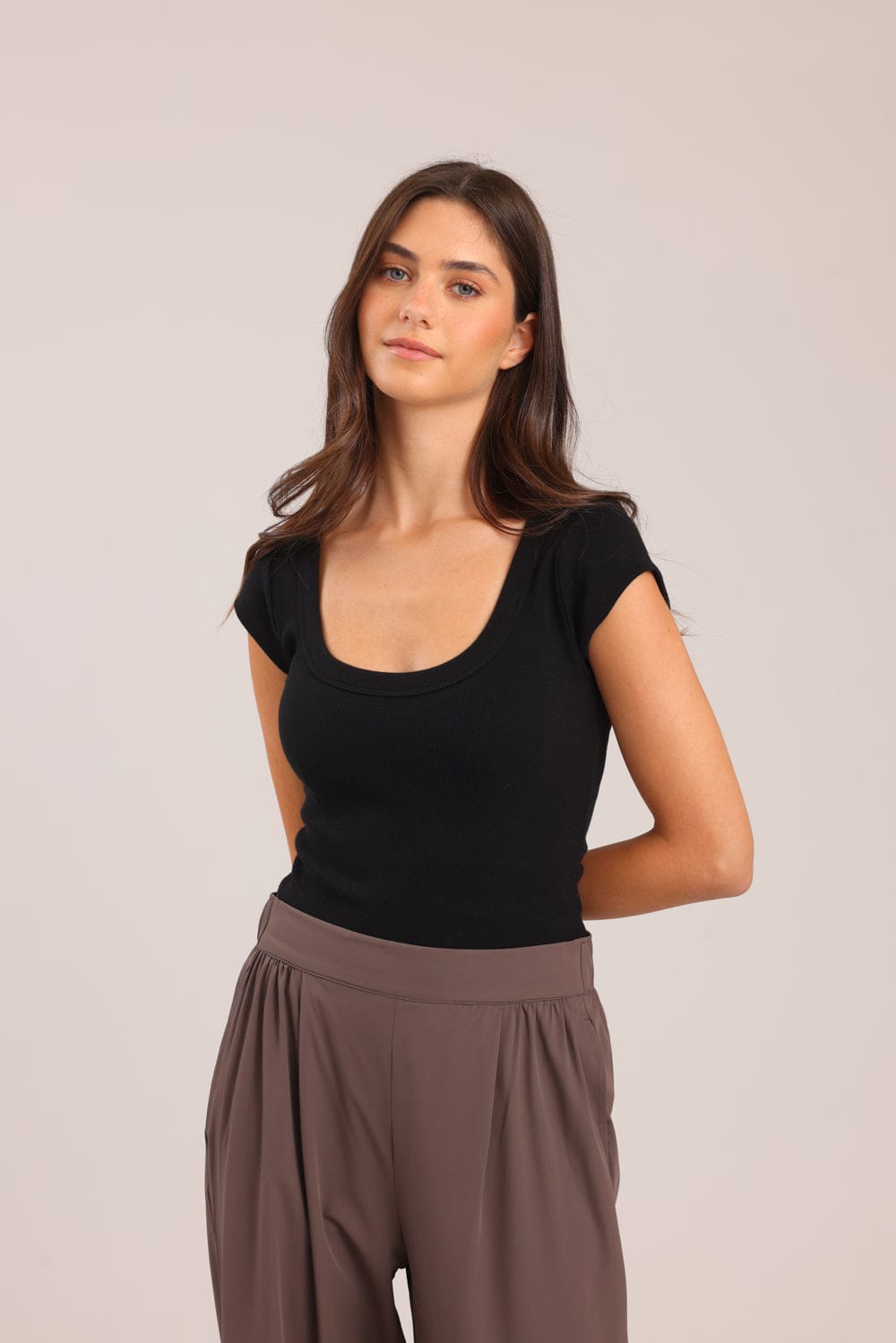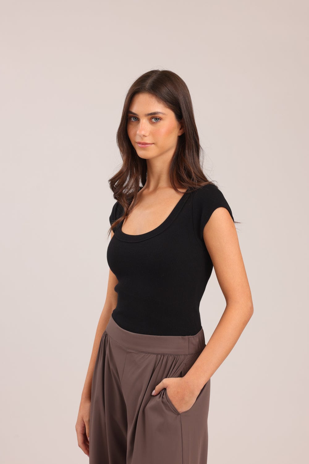 חולצת טריקו קצרה חלקה עם צווארון עגול