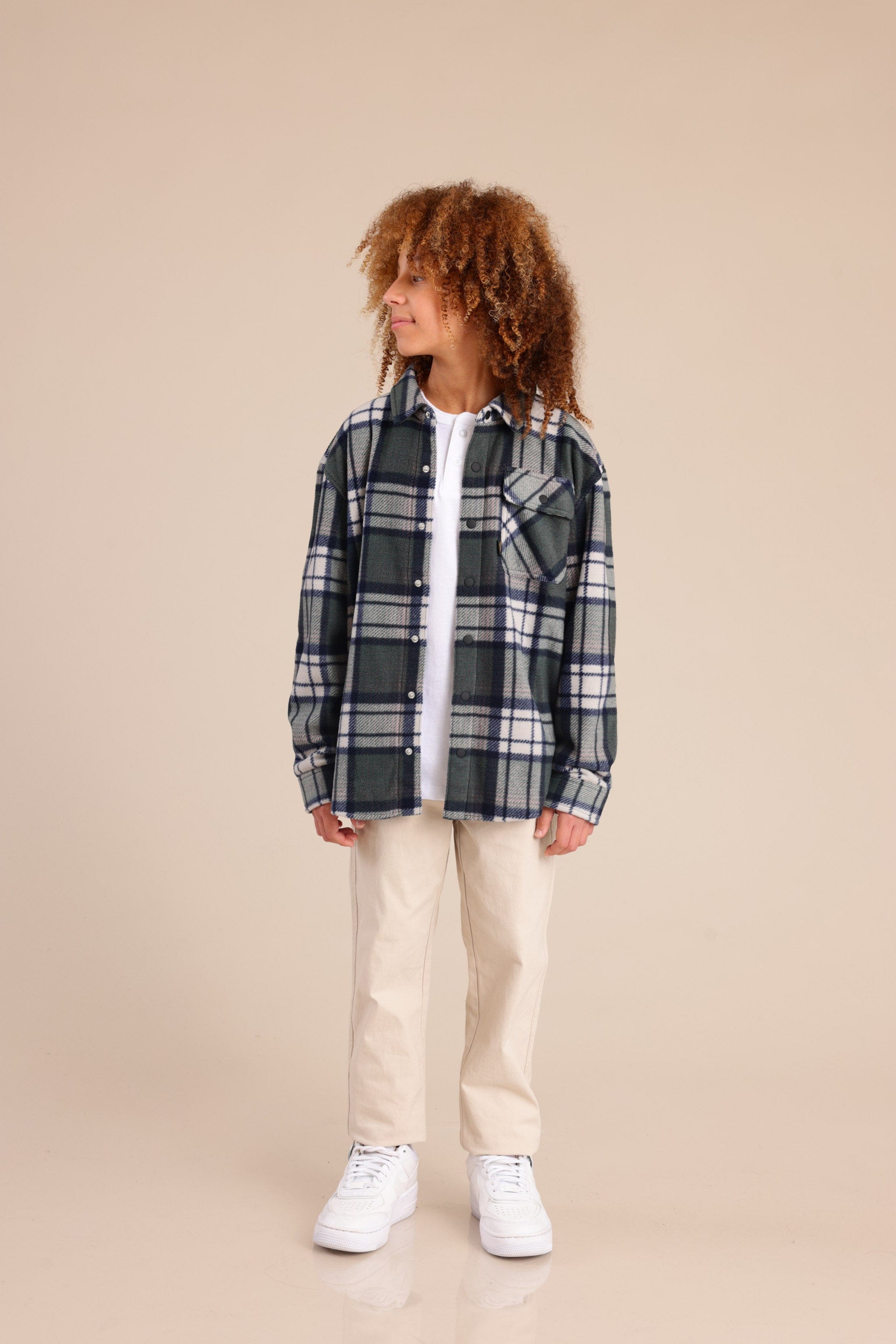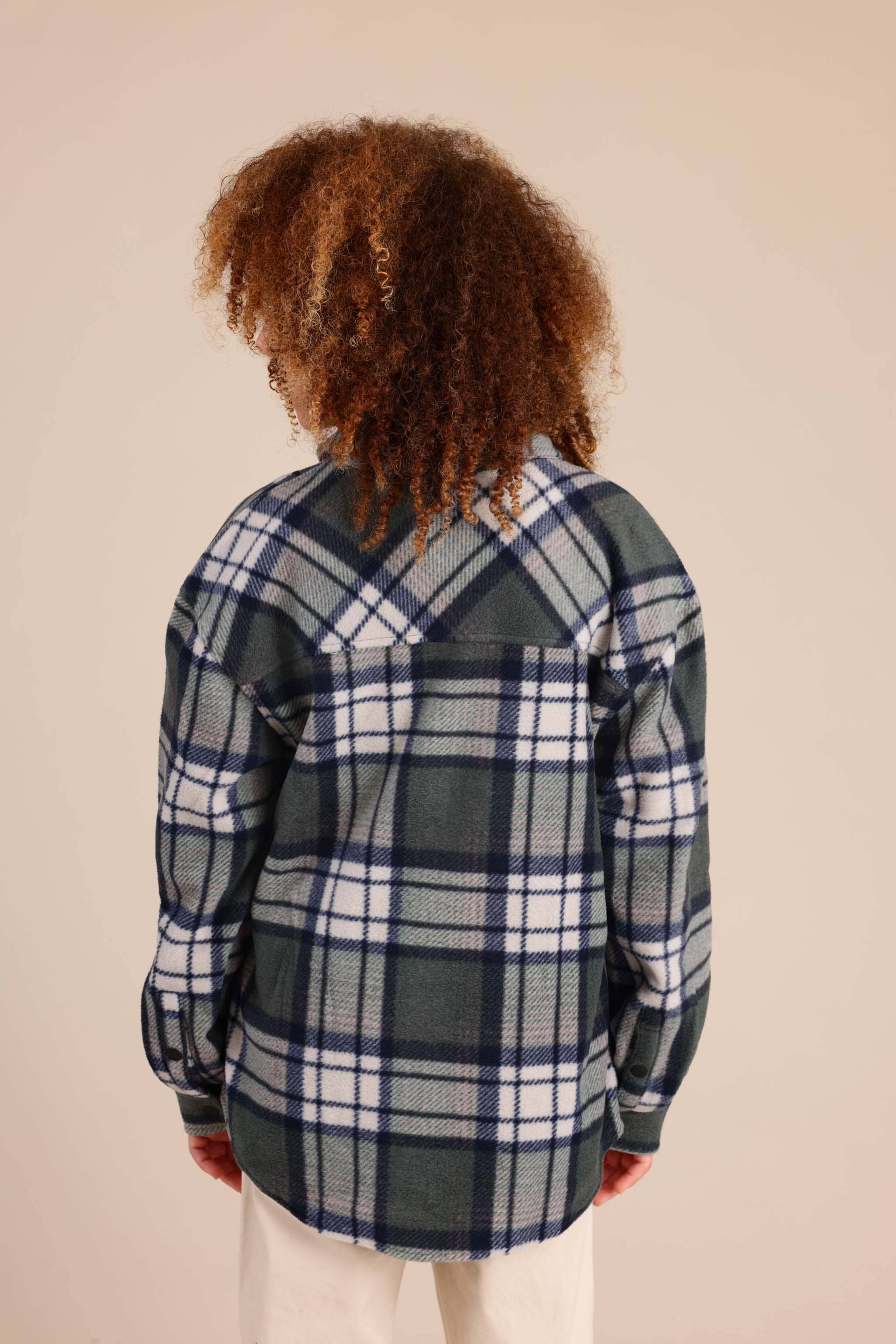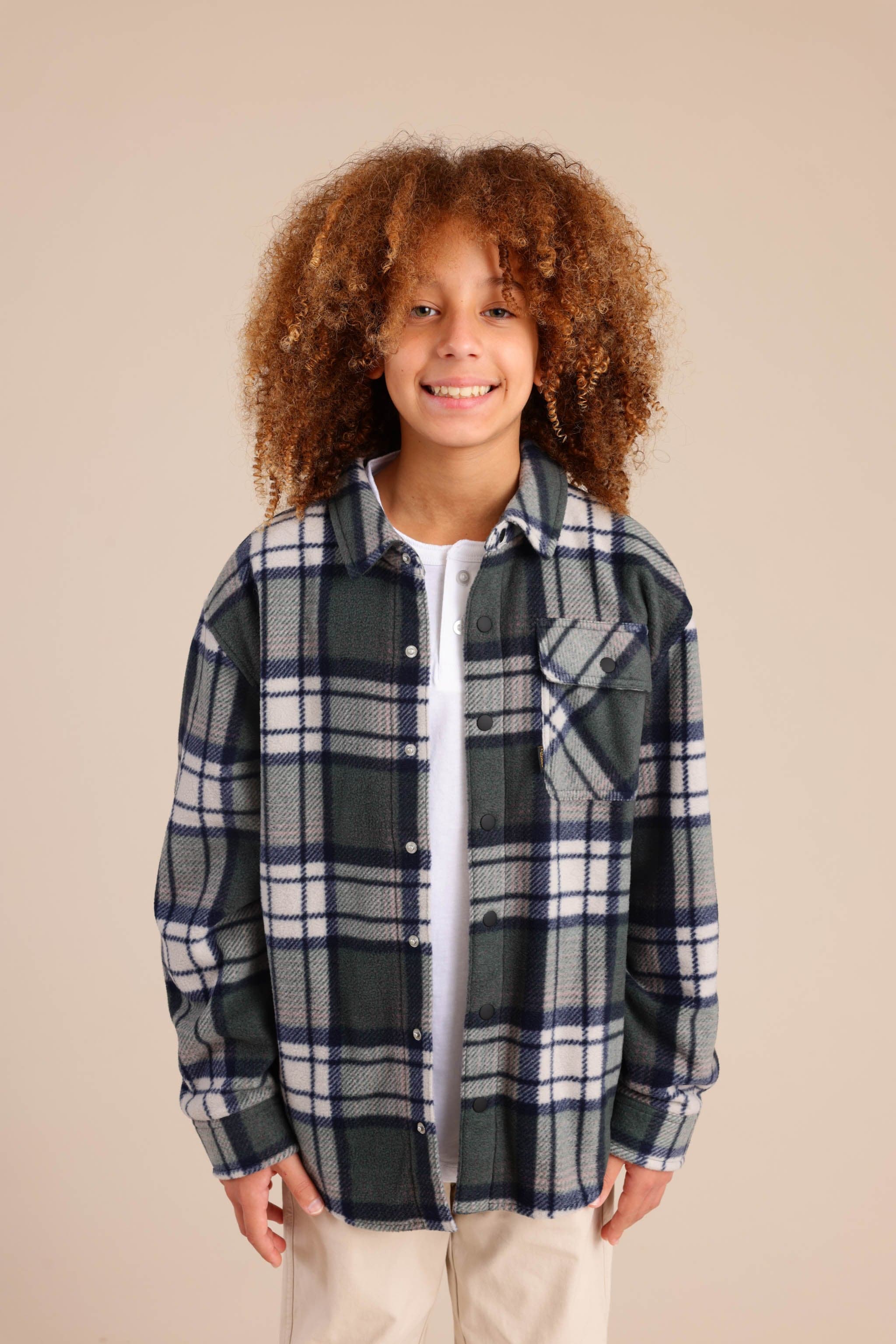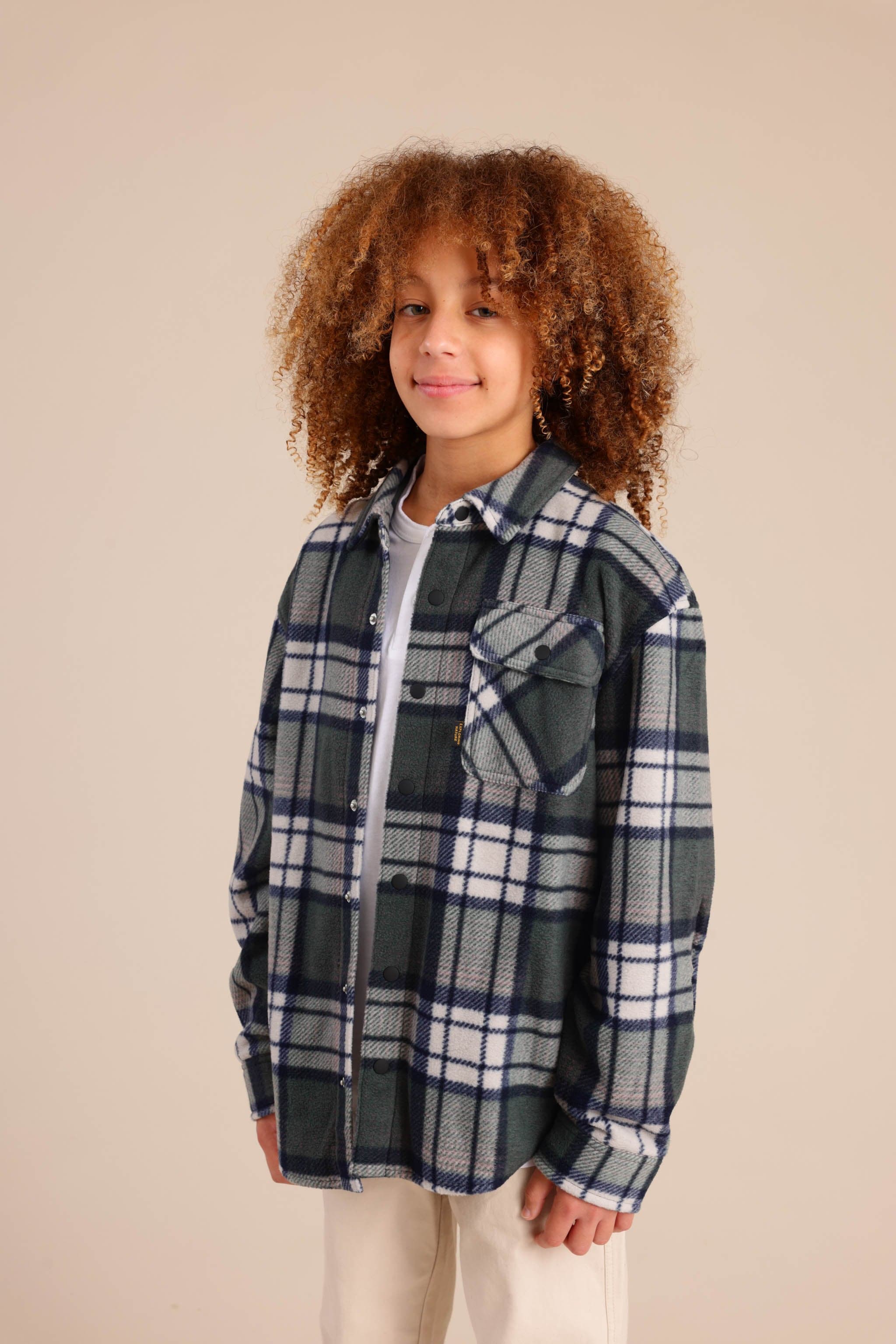 חולצת פליז משובצת מכופתרת עם כיס קדמי