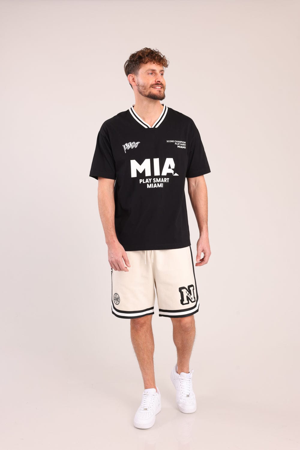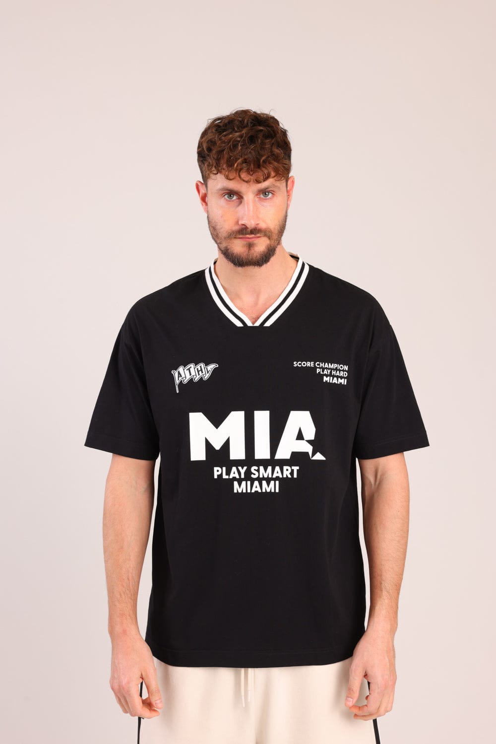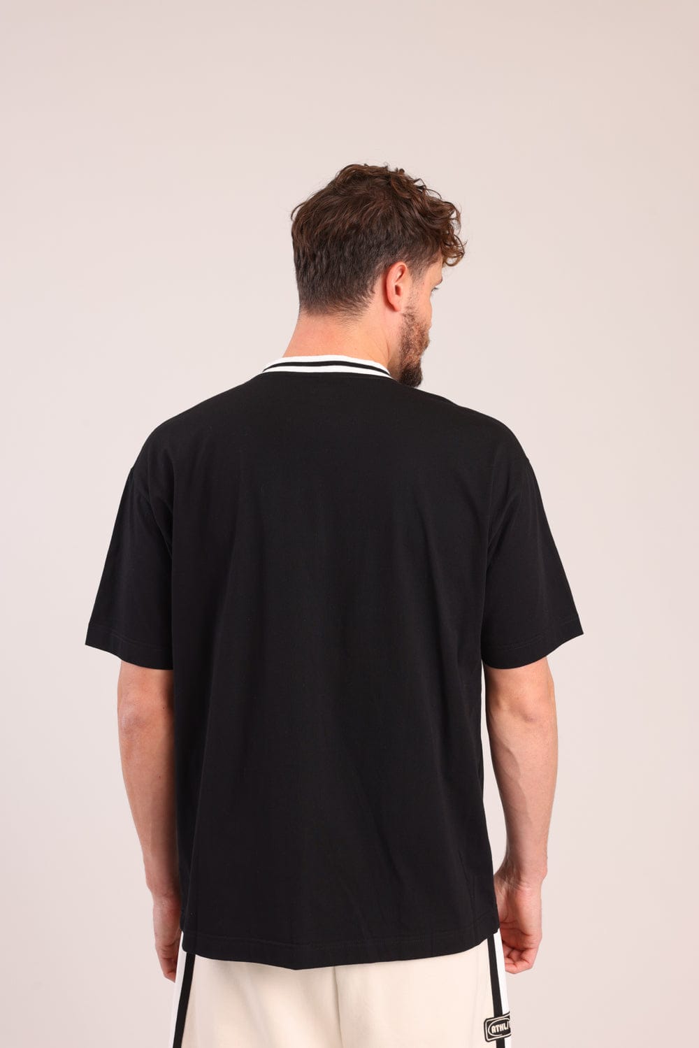חולצת טריקו קצרה , צווארון V עם פסים והדפס קדמי