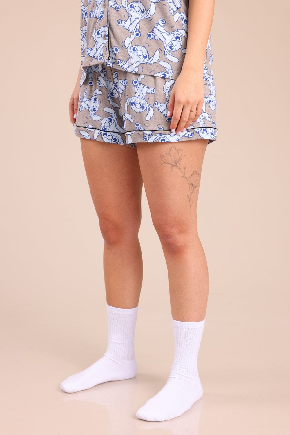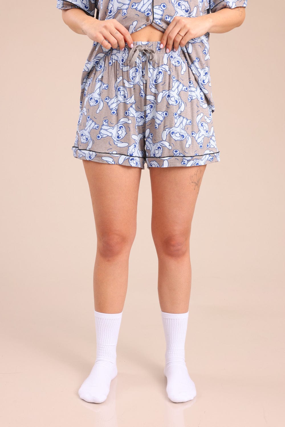 פיג'מת נשים קצרה מכופתרת ממותגת סטיץ' עם הדפסים