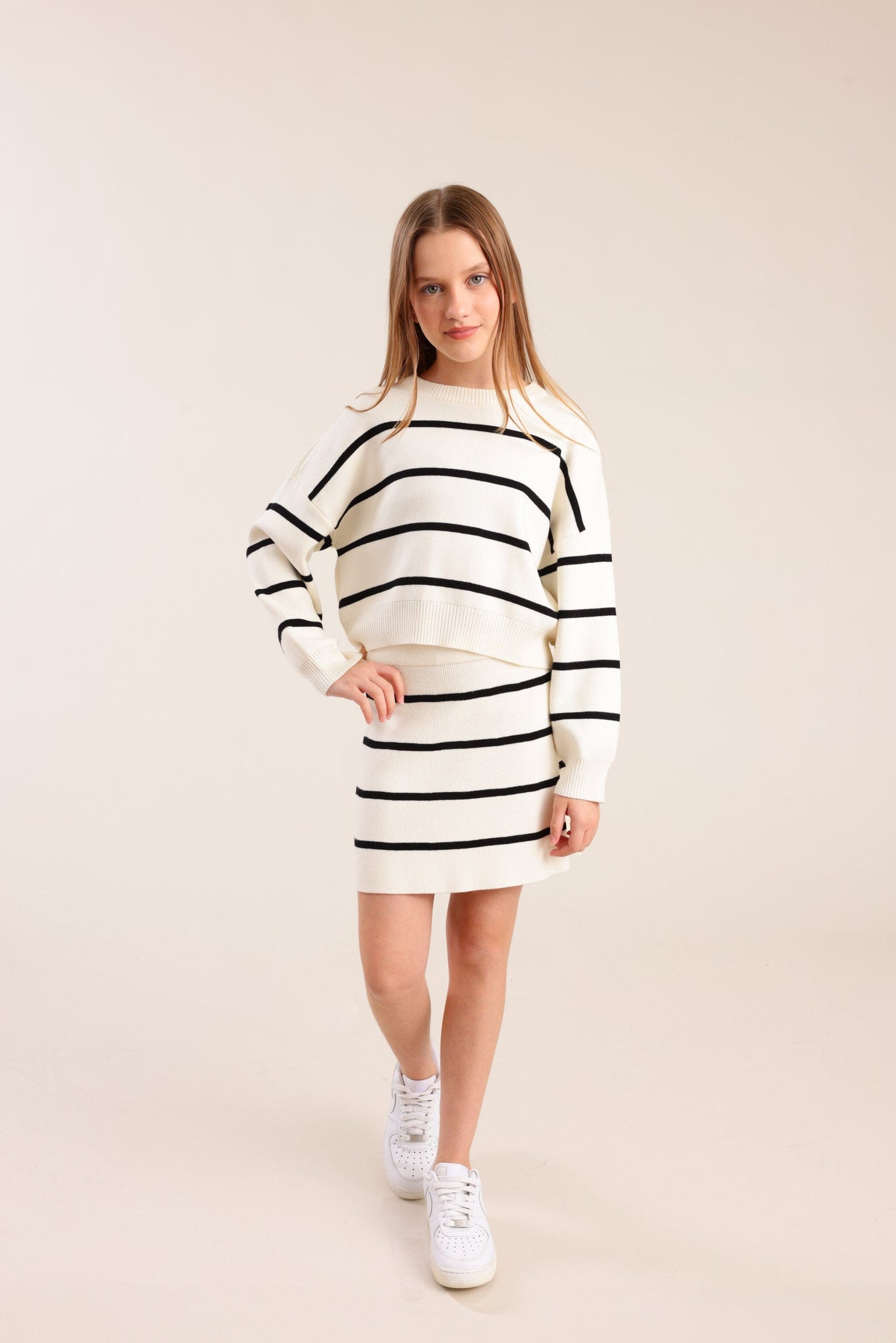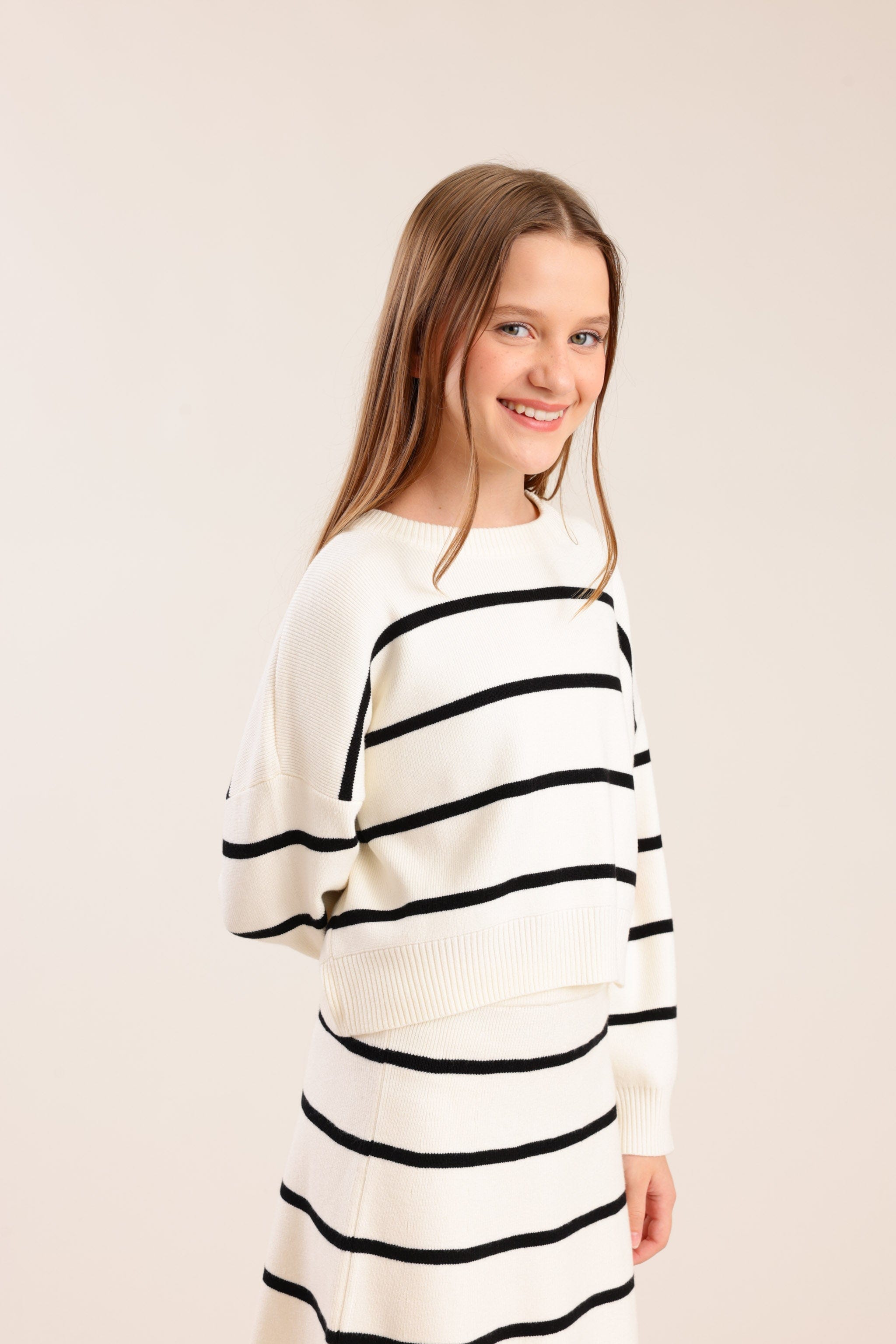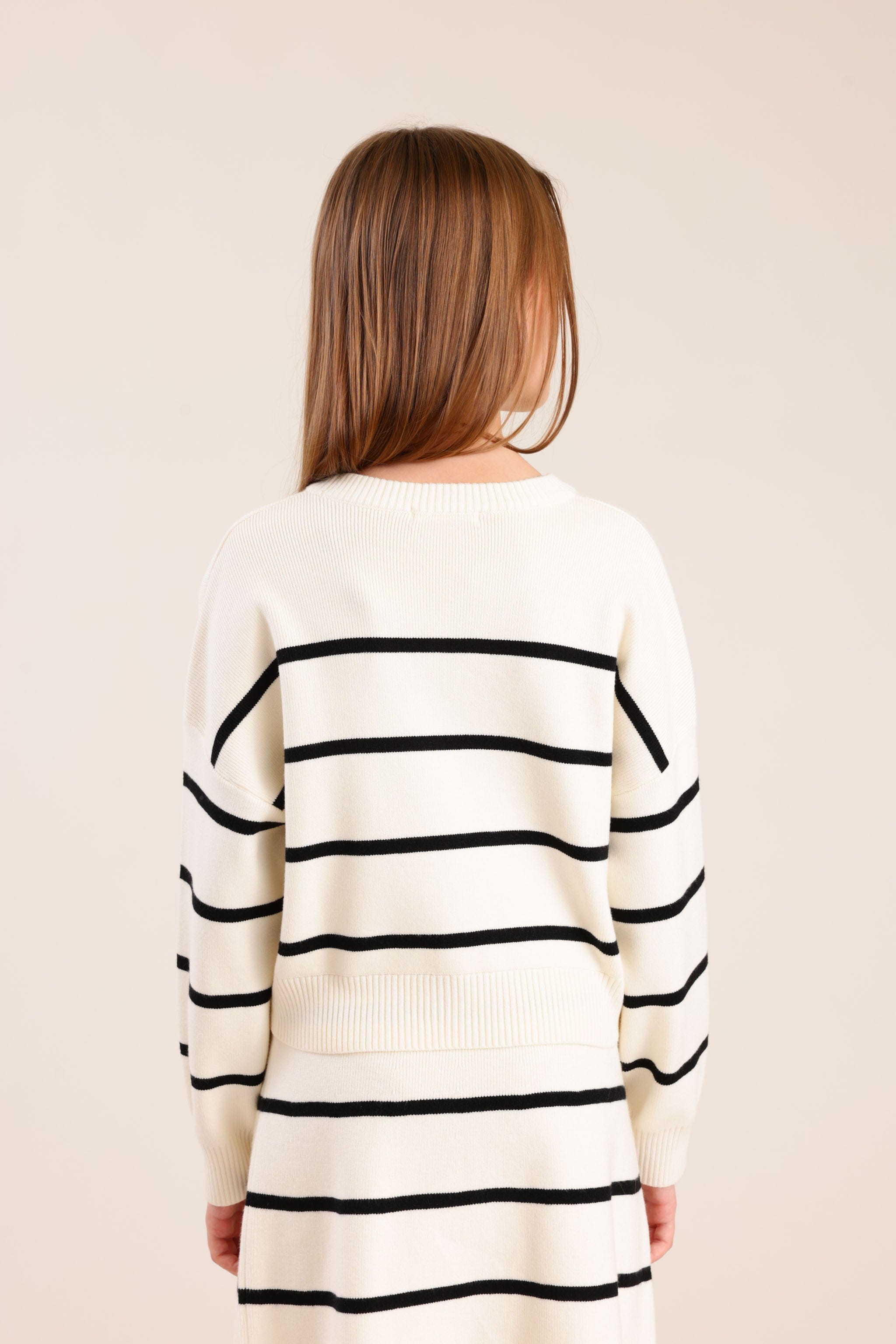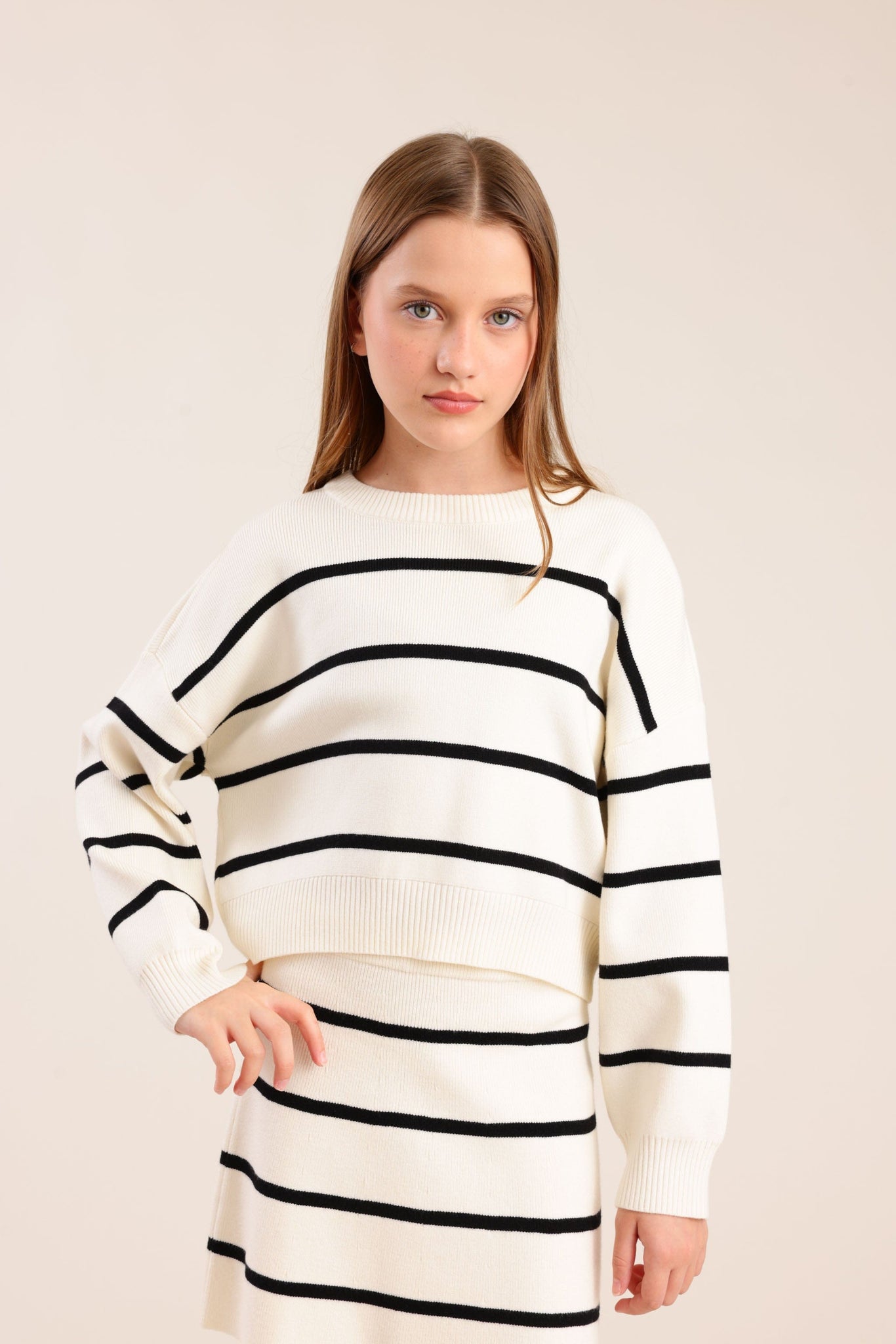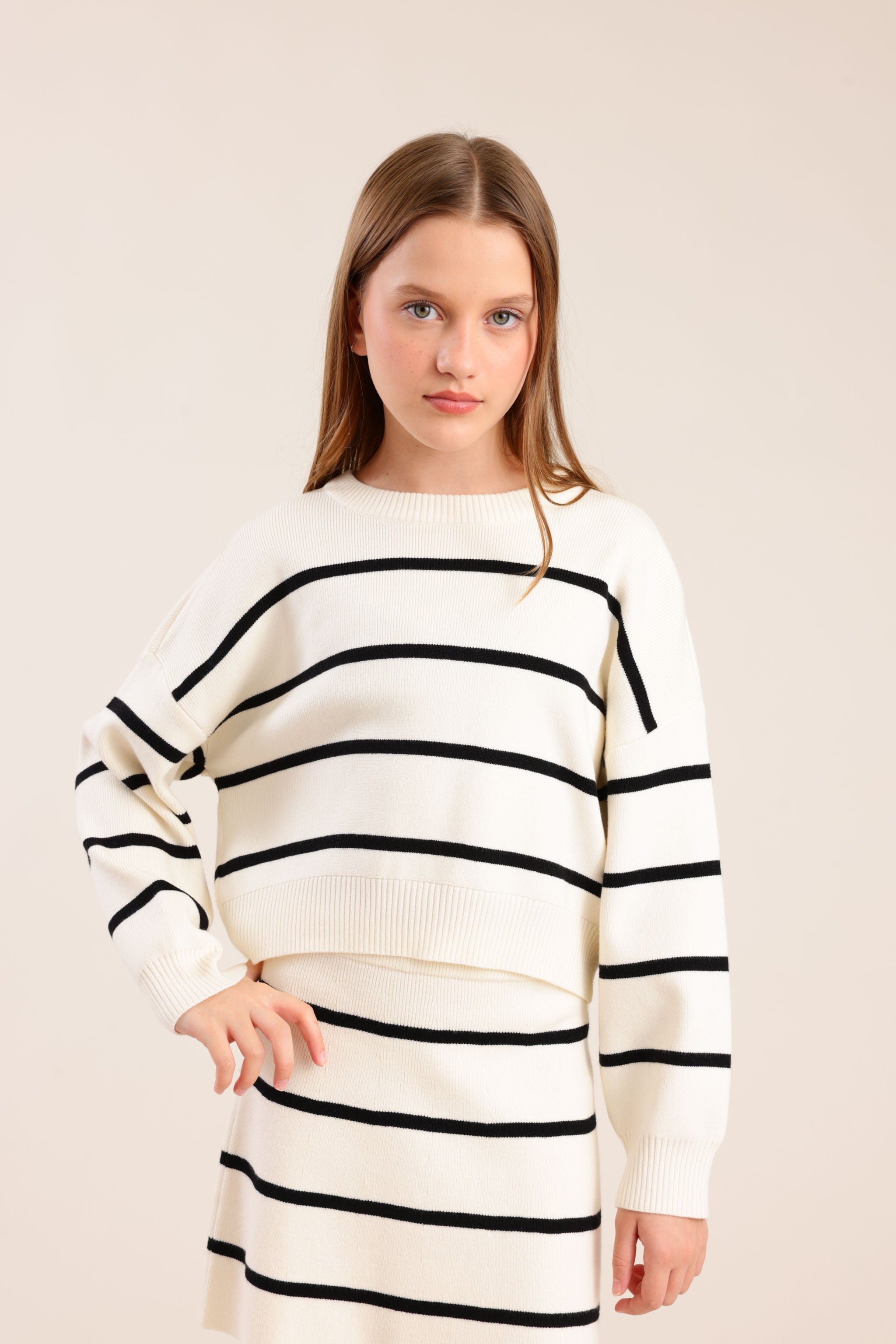 סריג פסים עם שרוולים ארוכים וגזרה נוחה מבד רך ונעים למגע מתאים למראה יומיומי